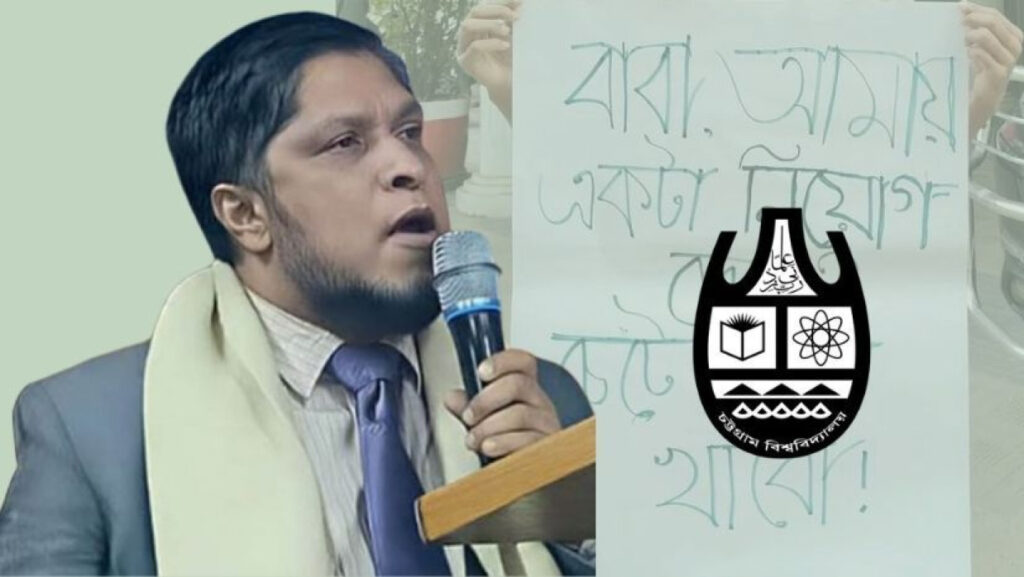 বিভাগীয় ফলাফলে পিছিয়ে থেকেও চট্টগ্রাম বিশ্ববিদ্যালয়ের (চবি) ফাইন্যান্স বিভাগে প্রভাষক হিসেবে নিয়োগ পেয়েছেন বিশ্ববিদ্যালয়টির উপ-উপাচার্য (একাডেমিক) অধ্যাপক ড. মোহাম্মদ শামীম উদ্দিন খানের মেয়ে মাহিরা শামীম। শুক্রবার (৯ জানুয়ারি) উপাচার্যের সম্মেলন কক্ষে বিশ্ববিদ্যালয়ের ৫৬৫তম সিন্ডিকেট সভায় তাকে নিয়োগের অনুমোদন করা হয়। এর আগে গত ১৯ ডিসেম্বর এই নিয়োগ বোর্ড অনুষ্ঠিত হয়েছিল।